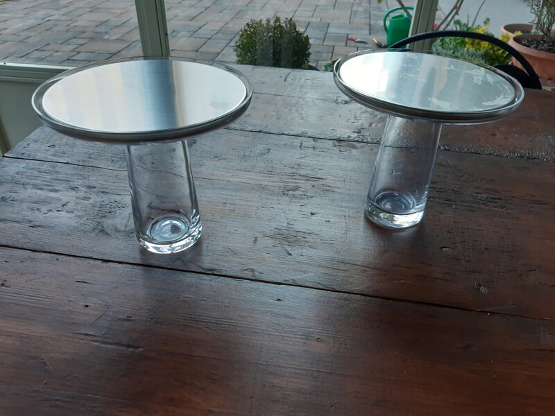 per dolci e frutta in vetro/acciaio . Dimensioni: 15cm (diam. piatto) x 15cm (H)